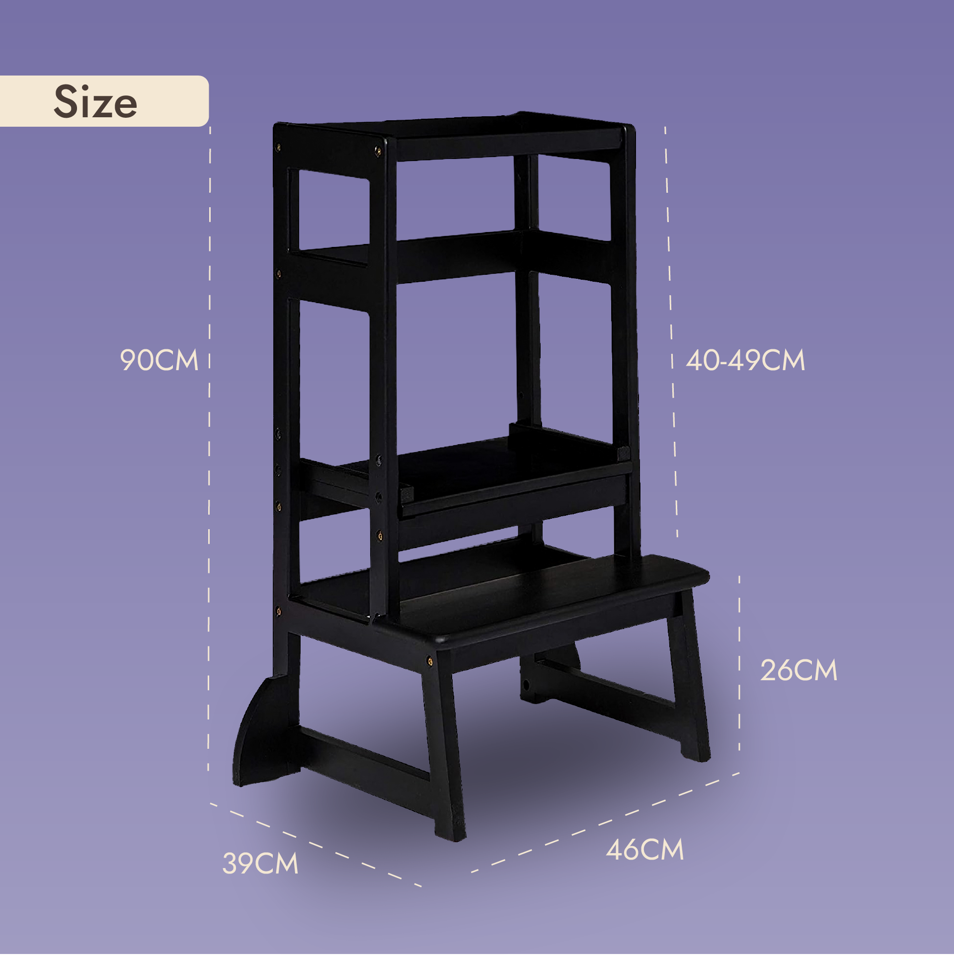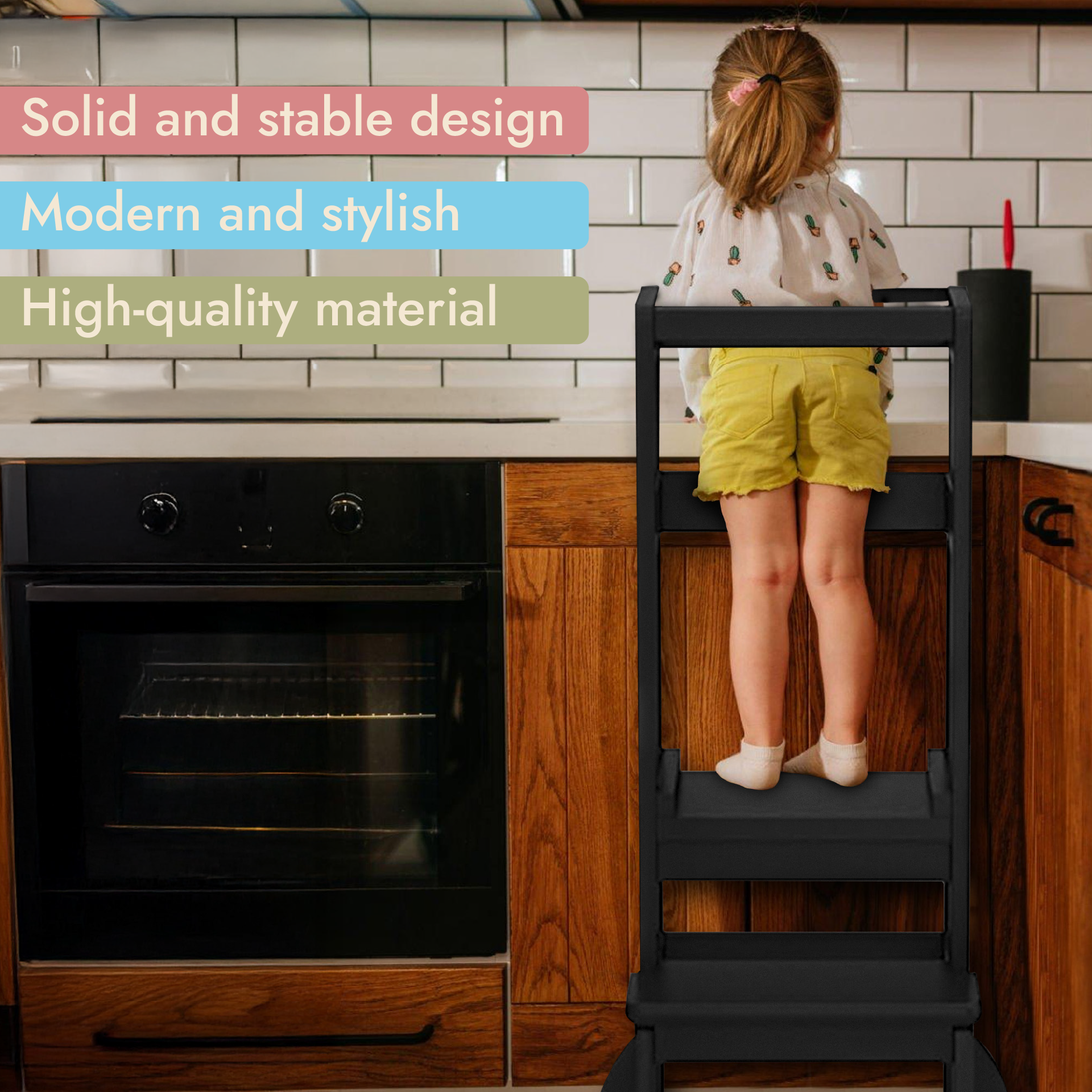 The tower is height-adjustable, folds flat for easy storage, and is quick to set up. With two steps, your child climbs up safely and confidently, encouraging independence and self-development in everyday routines.